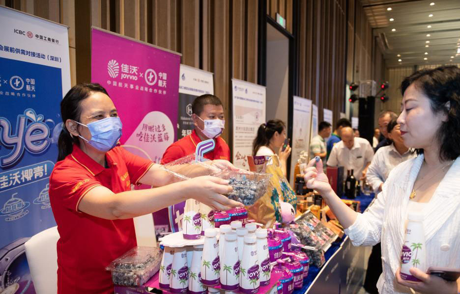 8月29日,在廣東省深圳市舉行的進(jìn)博會(huì)展前供需對接活動(dòng)上,參展商(左)向采購商介紹進(jìn)口藍(lán)莓。