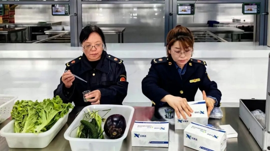 活動現(xiàn)場,工作人員正在對蔬菜進行檢測。張曉杰攝