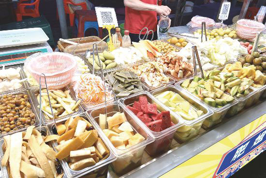 夏季的傍晚,走進(jìn)南寧平西夜市,酸嘢攤前總是圍滿了人。透明的玻璃缸中浸泡著各種水果和蔬菜,色彩斑斕,味道各異?!袄习澹瑏?lái)一份酸嘢。”“想吃什么自己選。”食客拿起小籃子,挑選了李子、菠蘿、芒果、番石榴、木瓜……老板接過(guò)小籃子,配以椒鹽粉、辣椒粉、甘草粉等調(diào)料混合攪拌。一塊酸嘢入口,咸辣鮮香,酸爽開(kāi)胃。