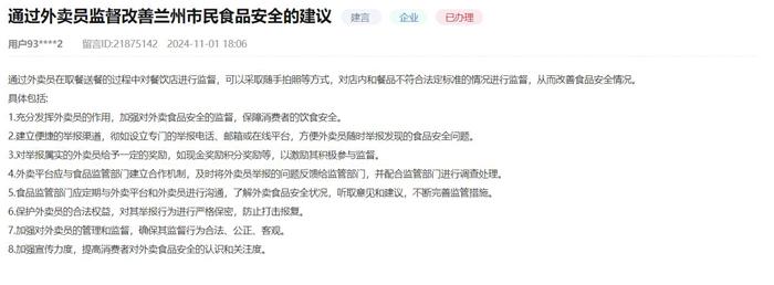 該網(wǎng)友建議建立便捷的舉報(bào)渠道,如設(shè)立專門的舉報(bào)電話、郵箱或在線平臺(tái),方便外賣員隨時(shí)舉報(bào)發(fā)現(xiàn)的食品安全問題;對(duì)舉報(bào)屬實(shí)的外賣員給予一定的獎(jiǎng)勵(lì),如現(xiàn)金獎(jiǎng)勵(lì)、積分獎(jiǎng)勵(lì)等,以激勵(lì)其積極參與監(jiān)督;食品監(jiān)管部門應(yīng)定期與外賣平臺(tái)和外賣員進(jìn)行溝通,了解外賣食品安全狀況,聽取意見和建議,不斷完善監(jiān)管措施;保護(hù)外賣員的合法權(quán)益,對(duì)其舉報(bào)行為進(jìn)行嚴(yán)格保密,防止打擊報(bào)復(fù);加強(qiáng)對(duì)外賣員的管理和監(jiān)督,確保其監(jiān)督行為合法、公正、客觀;加強(qiáng)宣傳力度,提高消費(fèi)者對(duì)外賣食品安全的認(rèn)識(shí)和關(guān)注度。