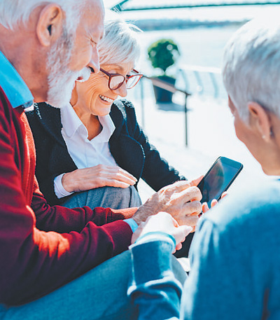 塞爾維亞三位老人在戶外交流學(xué)習(xí)使用智能手機經(jīng)驗。 |