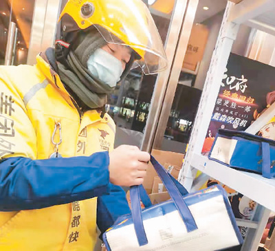 網(wǎng)約配送員游國(guó)棟正在取餐。 采訪對(duì)象供圖 |