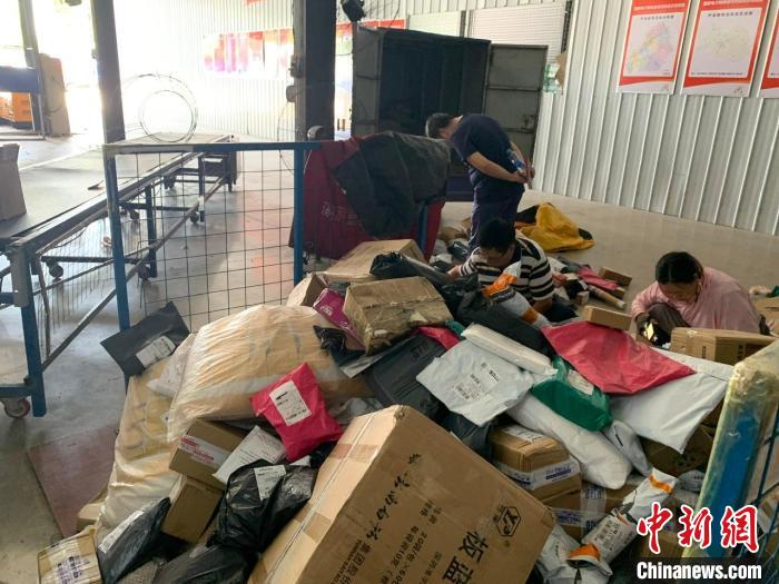 在江西省萍鄉(xiāng)市蘆溪縣供銷集配第四方物流分揀中心內(nèi),一名工作人員正在分揀各快遞公司的快件?!±铐嵑z