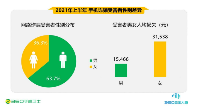 根據(jù)《報(bào)告》,從舉報(bào)用戶的性別差異來看,今年上半年360手機(jī)先賠接到的詐騙舉報(bào)男性受害者占63.7%,女性受害者占36.3%,男性比例明顯高于女性。而從人均損失來看,男性受害者的人均損失低于女性。其中,男性為15466元,女性為31538元。