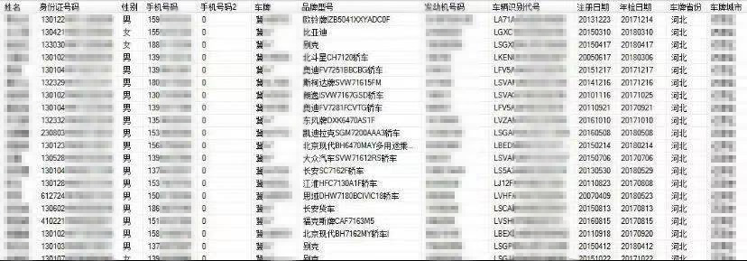 賣家向記者展示了之前交易的聊天記錄和車險(xiǎn)信息數(shù)據(jù)樣本,并保證“信息都是真實(shí)的”。在他展示的數(shù)據(jù)樣本中,包含車主姓名、身份證號(hào)、手機(jī)號(hào)、車牌、車型、發(fā)動(dòng)機(jī)號(hào)、車架號(hào)、車檢日期等詳細(xì)信息。