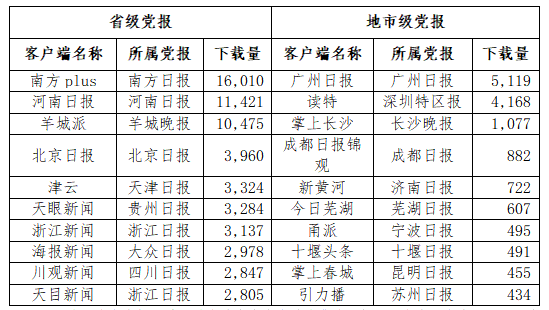 注:下載量為各黨報(bào)及其網(wǎng)站自建安卓客戶端在華為市場(chǎng)、小米應(yīng)用商店、VIVO市場(chǎng)、OPPO市場(chǎng)、魅族市場(chǎng)、應(yīng)用寶、百度手機(jī)助手、360手機(jī)助手、豌豆莢等9家安卓應(yīng)用商店的下載量合計(jì)。