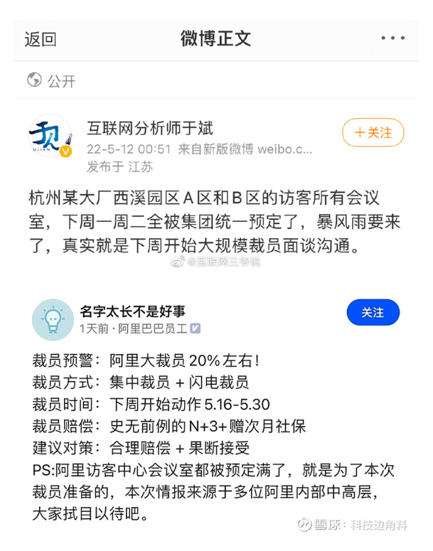 隨后,認(rèn)證為阿里巴巴員工的一名脈脈用戶發(fā)布“裁員預(yù)警”,其稱阿里將大裁員20%左右,裁員賠償是史無前例的N+3并贈(zèng)次月社保。該員工也透露,“阿里訪客中心的會(huì)議室都被預(yù)定滿了,就是為了本次裁員準(zhǔn)備的,本次情報(bào)來源于多位阿里內(nèi)部中高層?!?/p>