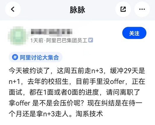 有阿里員工發(fā)文稱,“今天被約談了,這周五走N+3,緩沖29天是N+1,去年的校招生,目前手里沒offer,正在面試”。該員工還糾結(jié)是再待一個(gè)月還是拿n+3走人。還有員工發(fā)文證實(shí)阿里裁員N+3,并稱和之前流傳消息不同的是,最后期限提前到周三以及沒有次月社保。