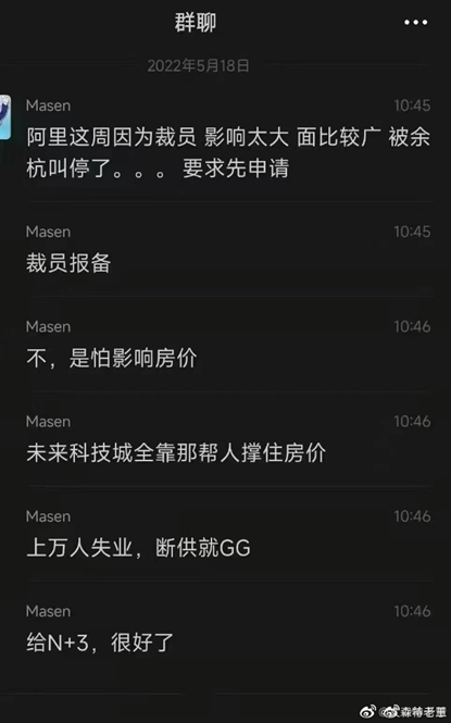 這般異常也引發(fā)了外界諸多猜測。5月18日,一則微信聊天記錄截圖在微博流傳,據(jù)截圖顯示,有網(wǎng)友稱“阿里這周因?yàn)椴脝T,影響太大,面比較廣,被余杭叫停了,要求先申請,裁員報(bào)備?!?月19日,另一網(wǎng)友出來“辟謠”,其稱“阿里裁員被余杭叫停是假消息,杭州炒房團(tuán)放的?!?/p>
