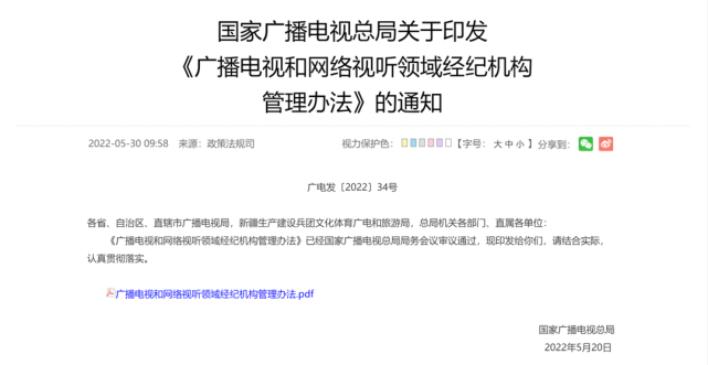 5月30日,國家廣播電視總局印發(fā)了《廣播電視和網(wǎng)絡(luò)視聽領(lǐng)域經(jīng)紀(jì)機(jī)構(gòu)管理辦法》(下稱《辦法》)的通知,并要求各省、自治區(qū)、直轄市廣播電視局,新疆生產(chǎn)建設(shè)兵團(tuán)文化體育廣電和旅游局,總局機(jī)關(guān)各部門、直屬各單位結(jié)合實際情況,貫徹落實該管理辦法。