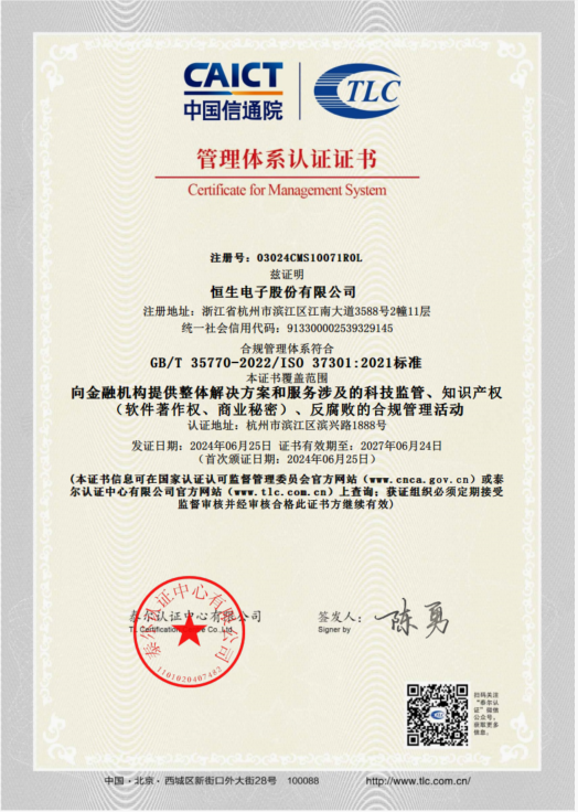 恒生電子股份有限公司的主要業(yè)務是向金融機構提供整體解決方案和服務,此次認證范圍覆蓋了主要業(yè)務涉及的科技監(jiān)管、軟件著作權、商業(yè)秘密、反腐敗的合規(guī)管理活動。ISO 37301是國際通用的合規(guī)管理體系認證標準,規(guī)定了組織建立、運行、保持和改進合規(guī)管理體系的要求,獲得該認證,表明恒生公司具備了該標準所要求的合規(guī)管理水平及能力。