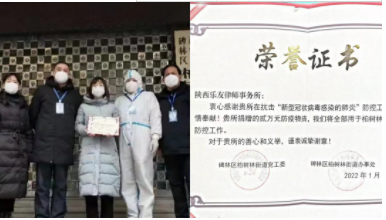 疫情發(fā)生后,陜西樂友律師事務(wù)所律師在西安市法律援助中心的安排下,堅守12345市民熱線法律服務(wù)專席,以專業(yè)法律服務(wù)為西安抗疫奉獻自己的力量。1月4日,律所為支持社區(qū)疫情防控工作,通過西安市碑林區(qū)柏樹林街道辦事處,向戰(zhàn)斗在一線的社區(qū)疫情防控人員捐贈價值兩萬元的防控物資。