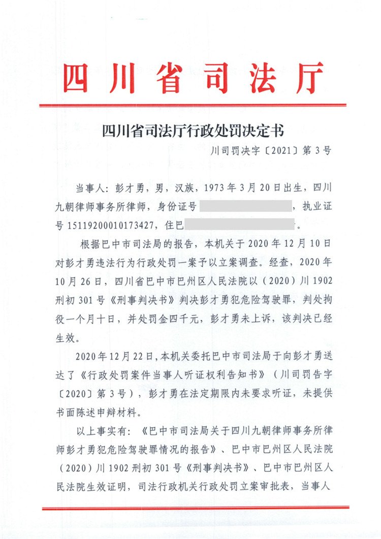 四川彭才勇因犯危險駕駛罪被處吊銷律師執(zhí)業(yè)證書