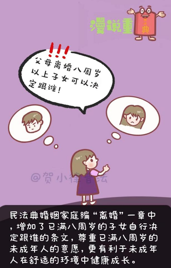民法典婚姻家庭編“離婚”一章中,增加了已滿(mǎn)八周歲的子女自行決定跟誰(shuí)的條文,尊重已滿(mǎn)八周歲的未成年人的意愿,更有利于未成年人在舒適的環(huán)境中健康成長(zhǎng)。