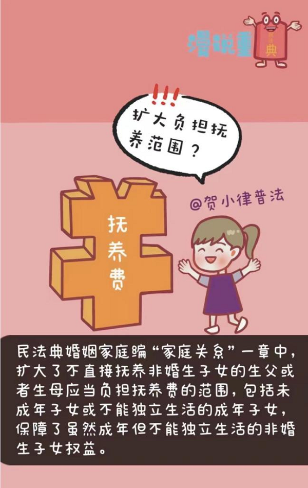 民法典婚姻家庭編“家庭關(guān)系”一章中,擴(kuò)大了不直接撫養(yǎng)非婚生子女的生父或者生母應(yīng)當(dāng)負(fù)擔(dān)撫養(yǎng)費(fèi)的范圍,包括未成年子女或者不能獨(dú)立生活的成年子女,保障了雖成年但不能獨(dú)立生活的非婚生子女權(quán)益,比如:殘疾兒、因患病或遭遇意外等無(wú)法獨(dú)立生活的非婚生子女。