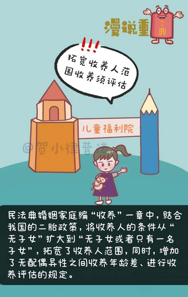 民法典婚姻家庭編“收養(yǎng)”一章中,結(jié)合我國(guó)的二胎政策,將收養(yǎng)人的條件從“無(wú)子女”擴(kuò)大到“無(wú)子女或者只有一名子女”,拓寬了收養(yǎng)人的范圍,同時(shí),增加了無(wú)配偶異性之間收養(yǎng)年齡差、進(jìn)行收養(yǎng)評(píng)估的規(guī)定。