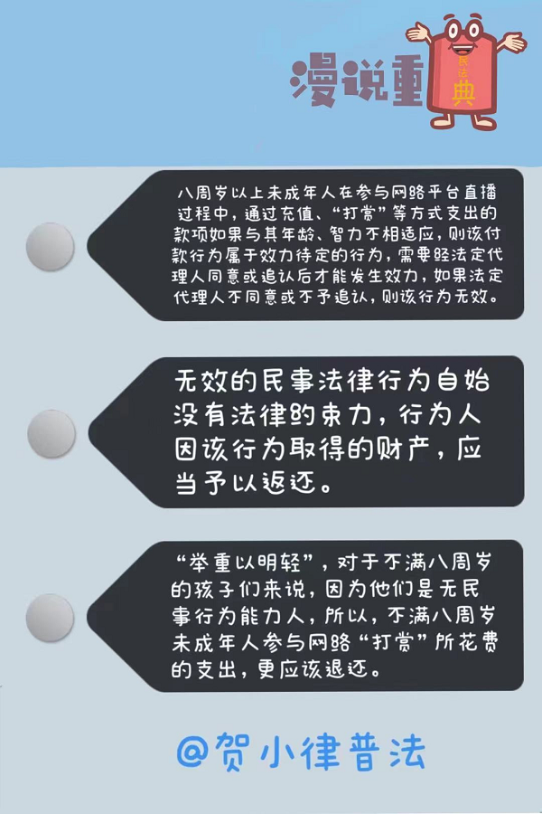 最高人民法院《關(guān)于依法妥善審理涉新冠肺炎疫情民事案件若干問(wèn)題的指導(dǎo)意見(jiàn)(二)》明確,八周歲以上的未成年人未經(jīng)其監(jiān)護(hù)人同意,參與網(wǎng)絡(luò)付費(fèi)游戲或者網(wǎng)絡(luò)直播平臺(tái)“打賞”等方式支出與其年齡、智力不相適應(yīng)的款項(xiàng),監(jiān)護(hù)人請(qǐng)求網(wǎng)絡(luò)服務(wù)提供者返還該款項(xiàng)的,人民法院應(yīng)予支持。
