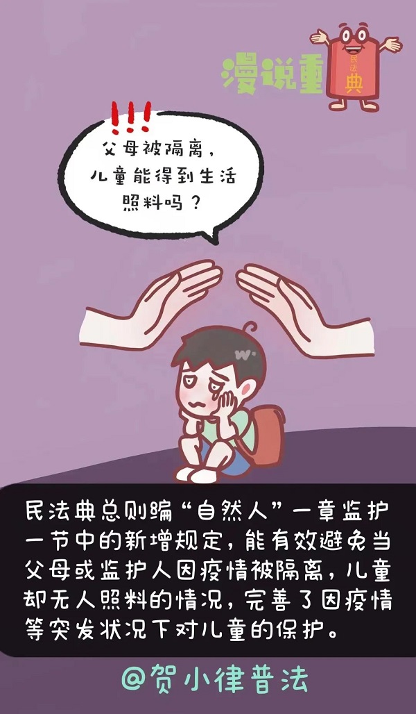 民法典總則編“自然人”一章監(jiān)護(hù)一節(jié)中的新增規(guī)定,能有效避免當(dāng)父母或監(jiān)護(hù)人因疫情被隔離,兒童卻無(wú)人照料的情況,完善了因疫情等突發(fā)狀況下對(duì)兒童的保護(hù)。