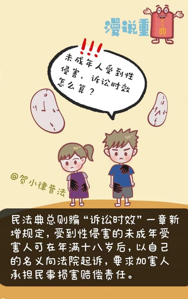 《中華人民共和國(guó)民法典》第一百九十一條 【未成年人遭受性侵害的損害賠償訴訟時(shí)效的起算】未成年人遭受性侵害的損害賠償請(qǐng)求權(quán)的訴訟時(shí)效期間,自受害人年滿(mǎn)十八周歲之日起計(jì)算。