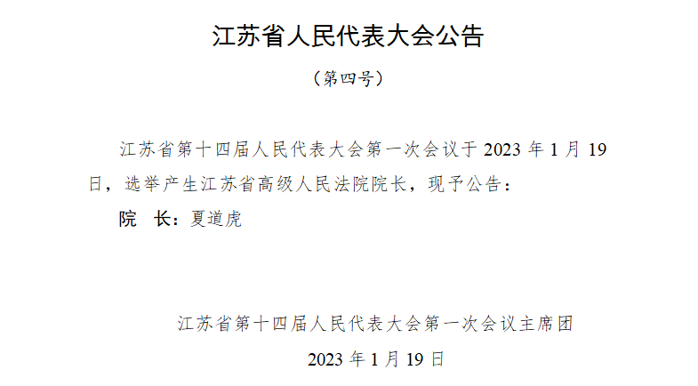 夏道虎當(dāng)選江蘇省高級人民法院院長