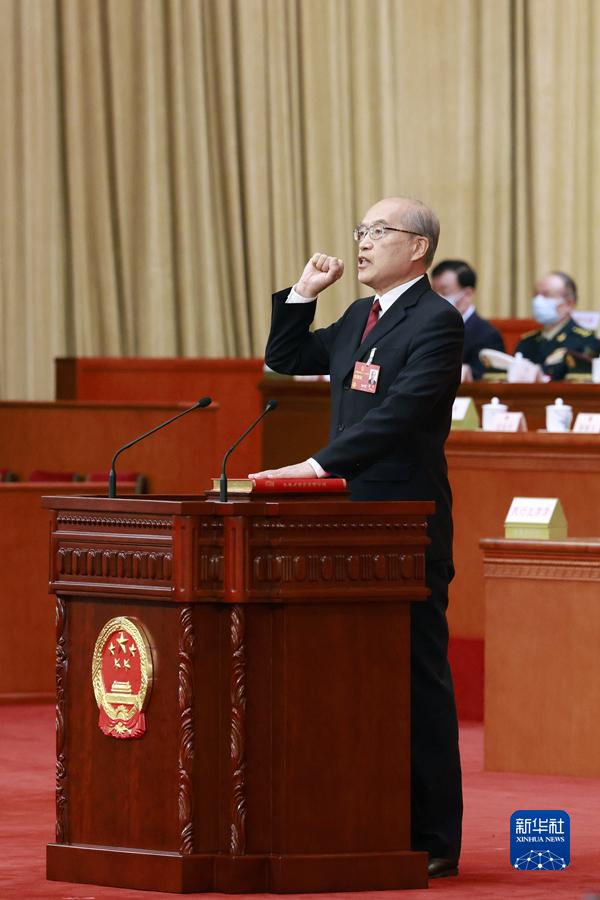 3月11日,十四屆全國人大一次會議在北京人民大會堂舉行第四次全體會議。張軍當(dāng)選為中華人民共和國最高人民法院院長。這是張軍進(jìn)行憲法宣誓。