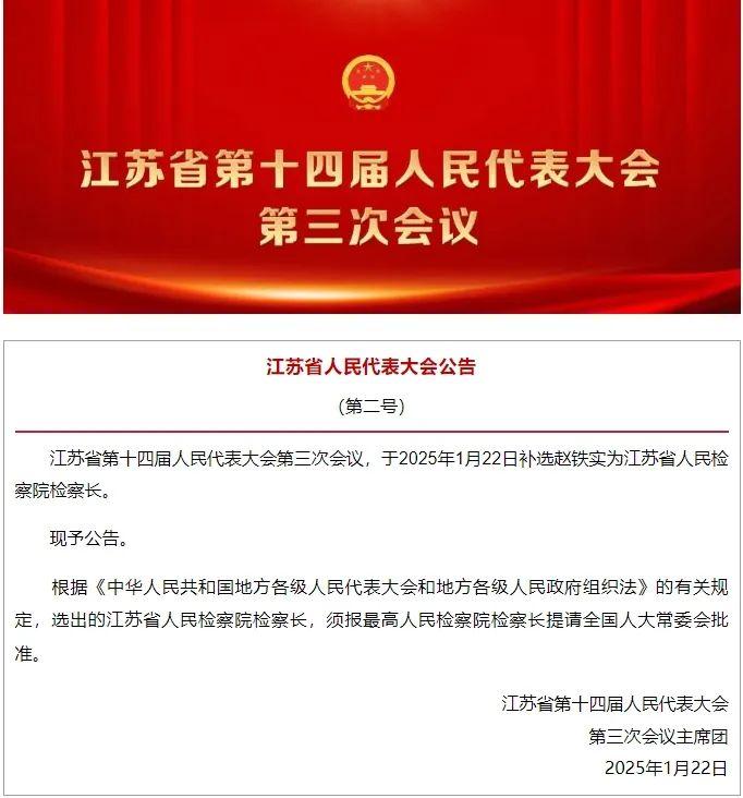 1月22日,江蘇省第十四屆人民代表大會第三次會議舉行第三次全體會議,補選趙鐵實為江蘇省人民檢察院檢察長。