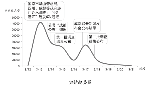 3月14日10時(shí)許,微信公眾號(hào)“成都發(fā)布”刊發(fā)文章《這些謠言信不得!》,盤(pán)點(diǎn)了警民沖突、家長(zhǎng)跳樓、家長(zhǎng)臥底等流傳甚廣的六大謠言。隨后,中國(guó)網(wǎng)、鳳凰網(wǎng)、四川在線等多家媒體轉(zhuǎn)載,對(duì)遏制網(wǎng)絡(luò)謠言起到?jīng)Q定性作用。相關(guān)部門(mén)回應(yīng)后,公眾討論逐步回歸食品安全本身,輿情呈現(xiàn)降溫跡象。