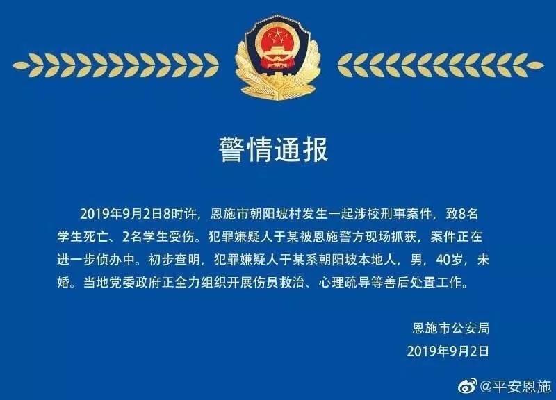9月2日11時(shí),湖北省恩施市政府官網(wǎng)發(fā)布通報(bào)稱,當(dāng)日8時(shí)許,恩施市白楊坪鎮(zhèn)朝陽(yáng)坡小學(xué)發(fā)生一起傷人事件,有10名學(xué)生受傷。該消息經(jīng)主流媒體轉(zhuǎn)載后震驚輿論場(chǎng),網(wǎng)民驚呼“血色開學(xué)日”。當(dāng)日晚22時(shí),“@平安恩施”發(fā)布通報(bào)稱,目前有8名學(xué)生死亡、2名學(xué)生受傷,犯罪嫌疑人于某系本地人,40歲,未婚。通報(bào)發(fā)出不久被刪除,引發(fā)網(wǎng)民追問,官方信息管控措施遭到輿論批評(píng)。隨后,《南方周末》等媒體介入報(bào)道,有關(guān)嫌疑人犯罪前科、服刑減刑經(jīng)歷等細(xì)節(jié)被曝光,關(guān)于其作案動(dòng)機(jī)的猜測(cè)充斥網(wǎng)絡(luò)。該案發(fā)生后,國(guó)家衛(wèi)健委派出應(yīng)急專家組,開展受傷學(xué)生醫(yī)療救治等工作,公安部、教育部部署加強(qiáng)中小學(xué)、幼兒園安全工作。目前,案件暫未有最新進(jìn)展公布。
