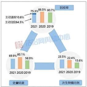 在納入統(tǒng)計的166起輿情事件中,政法機(jī)關(guān)主動通報案事件調(diào)查處置或?qū)徟薪Y(jié)果、公布干警違法違紀(jì)情況的共18起,占比10.8%;在輿情爆發(fā)后進(jìn)行主動回應(yīng)的有107起,占比64.5%;主動通報與主動回應(yīng)兩種主動作為的輿情事件合計占比75.3%,較前兩年雖略有回落,但持續(xù)處于較高水平。最終有處置結(jié)果的輿情事件116起,占比69.9%,較去年有所下降,但相較于2019年仍提升11個百分點(diǎn)??傮w來說,政法機(jī)關(guān)輿情回應(yīng)及引導(dǎo)意識較高,但在持續(xù)跟進(jìn)處置結(jié)果公開方面仍有提升空間。