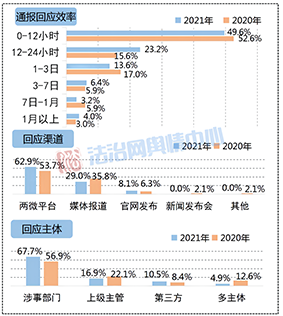 從回應(yīng)渠道來看,官方所依托的發(fā)聲渠道更為集中,有超過六成的輿情事件是借助兩微平臺做出回應(yīng),占比較2020年進(jìn)一步提升;依靠媒體報道進(jìn)行回應(yīng)的比重為29%,較上一年下降了近7個百分點(diǎn);以官網(wǎng)發(fā)布作為回應(yīng)渠道的事件略微增多,占比8.1%。目前來看,大多數(shù)回應(yīng)主體之所以選擇自有渠道主動做出回應(yīng)而非采取第三方轉(zhuǎn)達(dá)的方式,是因?yàn)橐环矫婕械膬?nèi)容公開明顯提升了回應(yīng)的權(quán)威性,避免被多方轉(zhuǎn)述造成信息誤差從而導(dǎo)致內(nèi)容被公眾曲解的風(fēng)險,另一方面也可以通過社交平臺直面公眾質(zhì)疑,與輿論達(dá)成直接有效的溝通,對接網(wǎng)民“輿論監(jiān)督”的參與期待,以便更好化解輿論爭議。