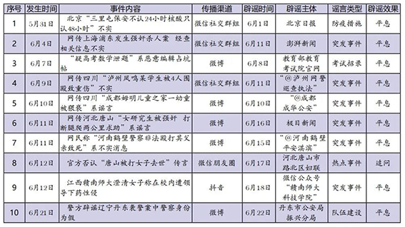 6月網(wǎng)絡(luò)涉法謠言辟謠榜單共梳理、匯總10起熱點(diǎn)事件,圍繞謠言持續(xù)時(shí)間、傳播渠道、產(chǎn)生地域、類型以及辟謠平臺等維度綜合分析,篩選兩起關(guān)注度較高、具有典型意義的案例研判,以期為網(wǎng)絡(luò)辟謠工作提供參考借鑒。