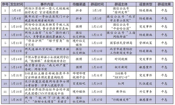 5月網(wǎng)絡(luò)涉法謠言辟謠榜單共梳理、匯總12起熱點(diǎn)謠言事件,圍繞謠言持續(xù)時(shí)間、傳播渠道、產(chǎn)生地域、所涉類型以及辟謠平臺等維度綜合分析,篩選兩起關(guān)注度較高、具有典型意義的案例研判,以期為網(wǎng)絡(luò)辟謠工作提供參考借鑒。