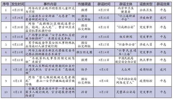 4月網(wǎng)絡(luò)涉法謠言辟謠榜單共梳理、匯總10起熱點(diǎn)事件,圍繞謠言持續(xù)時(shí)間、傳播渠道、產(chǎn)生地域、類型以及辟謠平臺等維度綜合分析,篩選兩起關(guān)注度較高、具有典型意義的案例研判,以期為網(wǎng)絡(luò)辟謠工作提供參考借鑒。