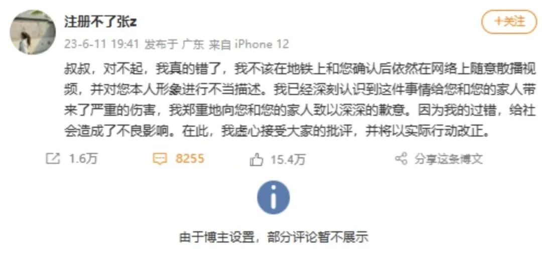 6月7日11時(shí)39分,微博用戶“@注冊(cè)不了張z”發(fā)文稱其在乘坐廣州地鐵8號(hào)線時(shí),懷疑遭到一位大叔偷拍,便要求大叔展示相冊(cè)“自證清白”,經(jīng)檢查發(fā)現(xiàn)相冊(cè)里沒有偷拍內(nèi)容后警告大叔“小心點(diǎn)啊,別亂拍”。這一舉動(dòng)引發(fā)爭(zhēng)議,部分網(wǎng)民支持女生的維權(quán)行為,但也有網(wǎng)民認(rèn)為這是“造謠生事”,發(fā)視頻曝光的行為構(gòu)成侵權(quán)。該博主還在文中稱大叔手法熟練,“不像第一次作案”,并回復(fù)那些指責(zé)其惡意誣陷的網(wǎng)民稱“既然沒有偷拍,那他為什么不為自己發(fā)聲”,相關(guān)言論引發(fā)網(wǎng)民不滿,有網(wǎng)民扒出該賬號(hào)所有人為河南大學(xué)學(xué)生張某,目前已保送為四川大學(xué)新聞傳播專業(yè)碩士研究生,其在快手、小紅書、抖音等多個(gè)平臺(tái)均有賬號(hào)運(yùn)營(yíng)。不少網(wǎng)民就當(dāng)事人身份和所學(xué)專業(yè)開始挖苦諷刺。6月9日,廣州地鐵通過媒體回應(yīng)稱,事發(fā)當(dāng)時(shí)已有警方介入處理,由于是誤會(huì),雙方已經(jīng)和解。四川大學(xué)也表示此事已經(jīng)在調(diào)查。