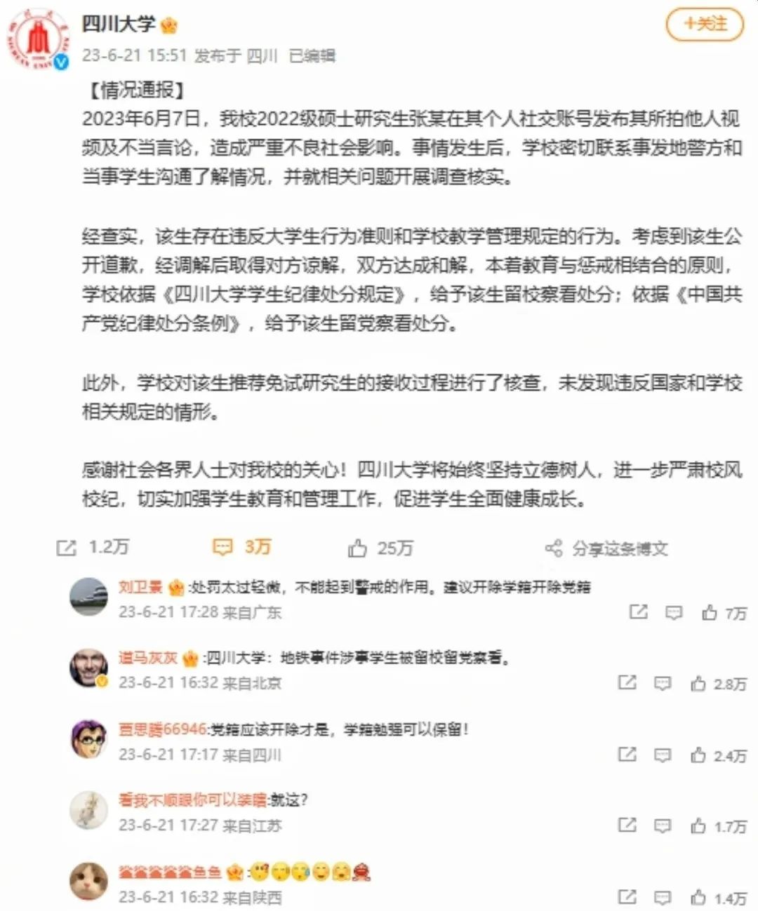 歷經(jīng)較長(zhǎng)的沉淀期后,6月21日,四川大學(xué)官微發(fā)布通報(bào)稱,最終給予張某留校和留黨察看處分。經(jīng)對(duì)張某保研過程進(jìn)行核查,未發(fā)現(xiàn)其違反國家和學(xué)校相關(guān)規(guī)定。多數(shù)網(wǎng)民不認(rèn)可此結(jié)果,認(rèn)為四川大學(xué)放任學(xué)生不當(dāng)行為,處置不公。有網(wǎng)民反問稱“明顯的造謠,為何僅以道歉結(jié)束”;還有網(wǎng)民認(rèn)為高校的教育機(jī)制和培養(yǎng)標(biāo)準(zhǔn)出現(xiàn)問題,質(zhì)疑如此品行的大學(xué)生將來進(jìn)入媒體,職業(yè)素養(yǎng)堪憂。大V“@老徐時(shí)評(píng)”指出:“造謠也好,拒不道歉也好,這些都屬于個(gè)人品德問題,并不是重點(diǎn)。這個(gè)事件的重點(diǎn),是后續(xù)被發(fā)現(xiàn)的保研等問題,關(guān)系到教育公平,關(guān)系到普通百姓的上升渠道和上升空間?!?月25日,北京一家律師事務(wù)所發(fā)布通報(bào),認(rèn)為四川大學(xué)的畢業(yè)生品質(zhì)難以信服,故該所不再招聘該校畢業(yè)生。部分網(wǎng)民對(duì)此叫好,部分人則認(rèn)為此舉涉嫌炒作和就業(yè)歧視?!癅人民日?qǐng)?bào)”評(píng)論呼吁,莫因個(gè)體案例為群體“貼標(biāo)簽”。