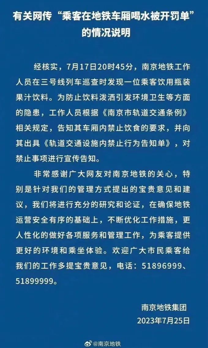 當(dāng)日18時(shí)許,南京地鐵在其官方微博發(fā)布《有關(guān)網(wǎng)傳“乘客在地鐵車廂喝水被開罰單”的情況說明》,文中稱,工作人員在列車巡查時(shí)發(fā)現(xiàn)一位乘客飲用瓶裝果汁飲料,為防止飲料潑灑引發(fā)環(huán)境衛(wèi)生等方面的隱患,工作人員根據(jù)相關(guān)規(guī)定,向其出具《軌道交通設(shè)施內(nèi)禁止行為告知單》,對(duì)禁止事項(xiàng)進(jìn)行宣傳告知。南京地鐵還表示,將“不斷優(yōu)化工作措施,更人性化地做好各項(xiàng)服務(wù)和管理工作”。