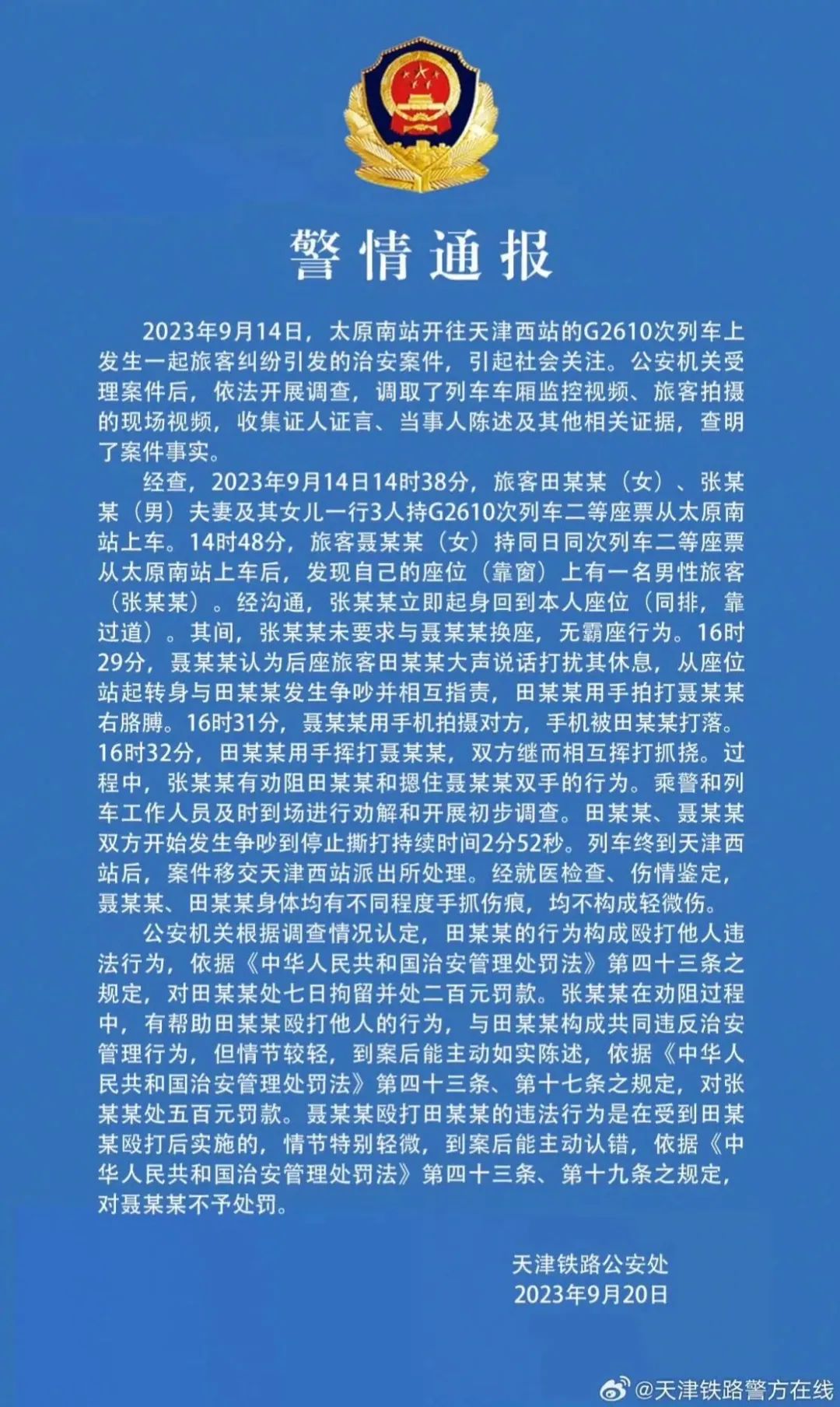 數(shù)日后,事件迎來動態(tài)進展。9月20日,天津鐵路公安處再次發(fā)布詳細通報,還原了事發(fā)過程,表示雙方矛盾系因口角糾紛引發(fā),不存在霸座行為,雙方均不構(gòu)成輕微傷,田某某有毆打他人違法行為,將其拘留七日并罰款200元,張某某勸阻過程中幫助田某某毆打他人,被處以500元罰款,聶某某的毆打行為是在受到田某某毆打后實施的,因情節(jié)特別輕微且主動認錯不予處罰。網(wǎng)民認可通報內(nèi)容,稱“原來如此”,贊官方處理得當。