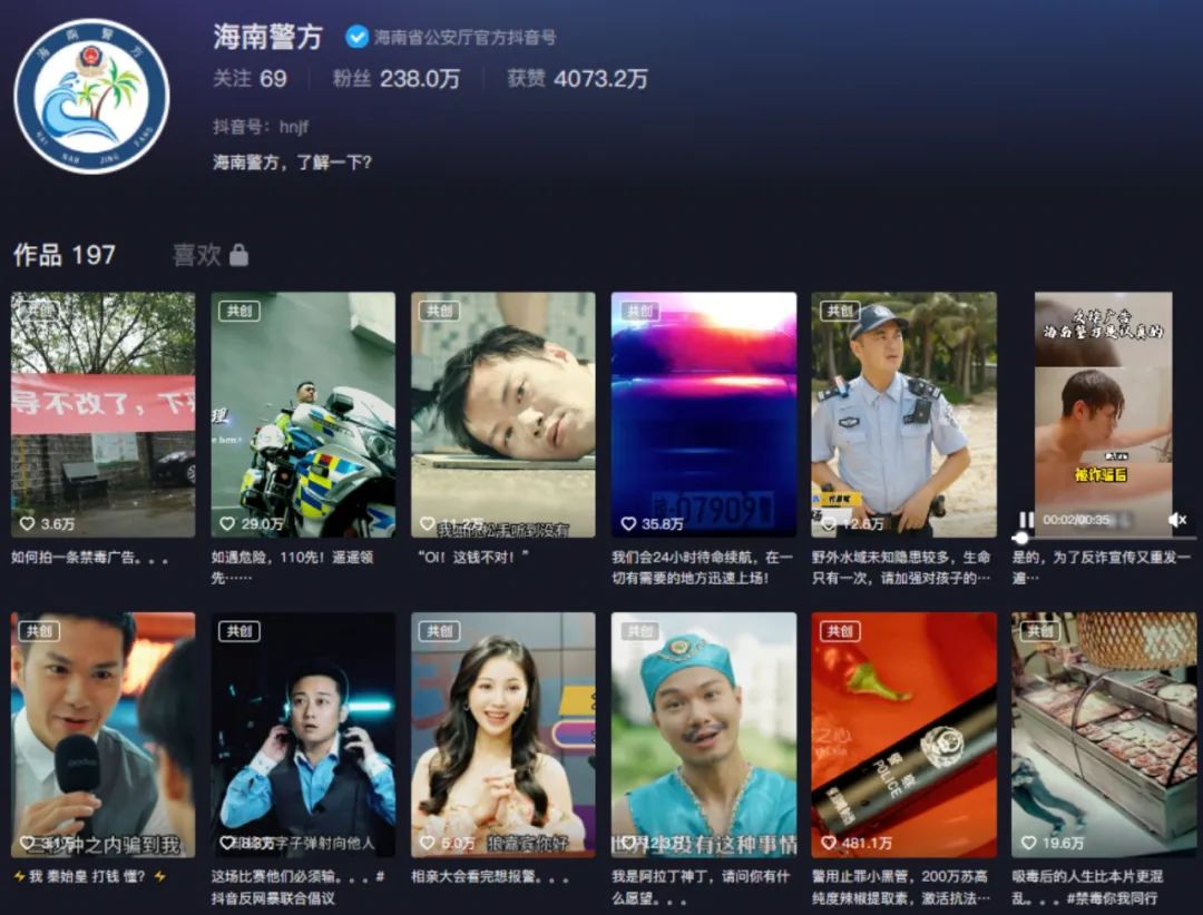 豐富的傳播渠道和多樣的共創(chuàng)模式可以說是“海南警方”短視頻成功破圈的基礎(chǔ)。在傳播渠道方面,“海南警方”拍攝的短視頻會依據(jù)內(nèi)容形式,首先投放在抖音、快手以及微信視頻號等平臺,通過擴充社交媒體傳播渠道,最大范圍內(nèi)汲取公域流量,打好用戶底盤。除了以短視頻平臺為核心的投放策略外,“海南警方”還利用其他平臺作為引流渠道,如以日常工作宣傳為主的今日頭條和微博上,“海南警方”發(fā)布對應(yīng)的視頻合集,嘗試突破平臺壁壘,最大程度吸引網(wǎng)民注意力。在創(chuàng)作方式上,“海南警方”根據(jù)視頻內(nèi)容與其他賬號合作,如《這錢不對》和《禁毒版盜夢空間》兩部作品,由于涉及反邪教和禁毒題材,“海南警方”分別與中國反邪教和海南禁毒合作拍攝,這種基于宣傳主旨達成的合作模式可以幫助賬號有效拓展分眾渠道,觸達更多用戶?!昂D暇健边€有部分視頻是與下級公安的合作,包括昌江警方、澄邁警方等,這一方面可以發(fā)揮海南警方的虹吸效應(yīng),聚合更多流量助推宣傳效果,另一方面也可以反哺弱勢賬號,打造傳播矩陣,為普法宣傳開辟更多通路。