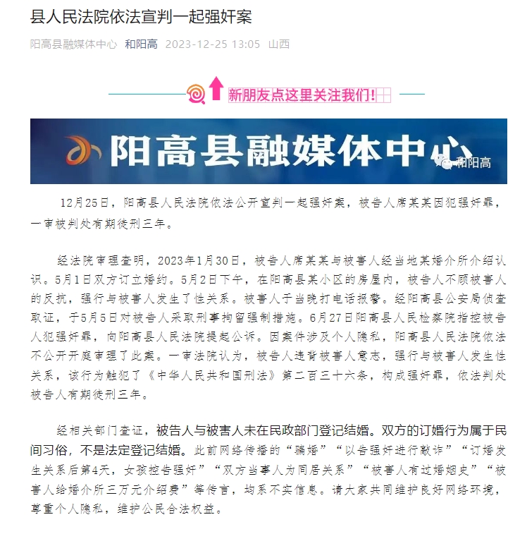 2023年12月25日13時許,陽高縣融媒體中心微信公眾號“和陽高”通報此案審理情況。通報指出,經(jīng)法院審理查明,2023年1月30日,被告人與被害人經(jīng)當?shù)啬郴榻樗榻B認識。5月1日雙方訂立婚約。5月2日下午,在陽高縣某小區(qū)的房屋內(nèi),被告人不顧被害人反抗,強行與被害人發(fā)生了性關(guān)系。被害人于當晚打電話報警。經(jīng)陽高縣公安局偵查取證,于5月5日對被告人采取刑事拘留強制措施。經(jīng)相關(guān)部門查證,被告人與被害人未在民政部門登記結(jié)婚。雙方的訂婚行為屬于民間習(xí)俗,不是法定登記結(jié)婚。此前,此前網(wǎng)絡(luò)傳播的“騙婚”“以告強奸進行敲詐”等多個傳言,均系不實信息。這一通報初步回應(yīng)了多個輿論關(guān)切點,網(wǎng)民觀點開始出現(xiàn)扭轉(zhuǎn),部分網(wǎng)民指出訂婚不等于同意發(fā)生性關(guān)系。