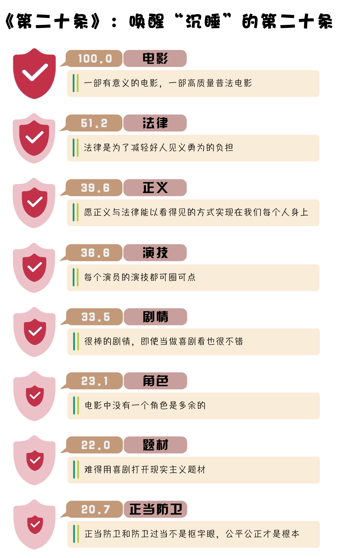 (制作:法治網(wǎng)輿情中心 數(shù)據(jù)來源:豆瓣 注:選取《第二十條》的部分豆瓣短評(píng),對所選取的短評(píng)做NLP分詞處理,對詞語做歸一化處理,將頻度最高的詞語規(guī)定為100)