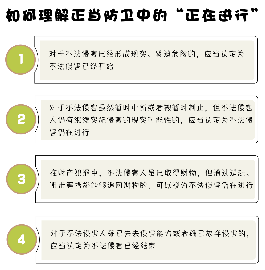 《檢察日報(bào)》在《〈第二十條〉法條解析:正當(dāng)防衛(wèi)如何適用,法學(xué)專家、檢察官現(xiàn)身解答》一文中,針對法條中所要求的“正在進(jìn)行”采訪了清華大學(xué)法學(xué)院教授張建偉,張建偉表示:“所謂‘正在進(jìn)行’就是侵害行為已經(jīng)著手實(shí)施、尚未結(jié)束,侵害行為處于時(shí)間起點(diǎn)到終點(diǎn)的過程?!?/span>