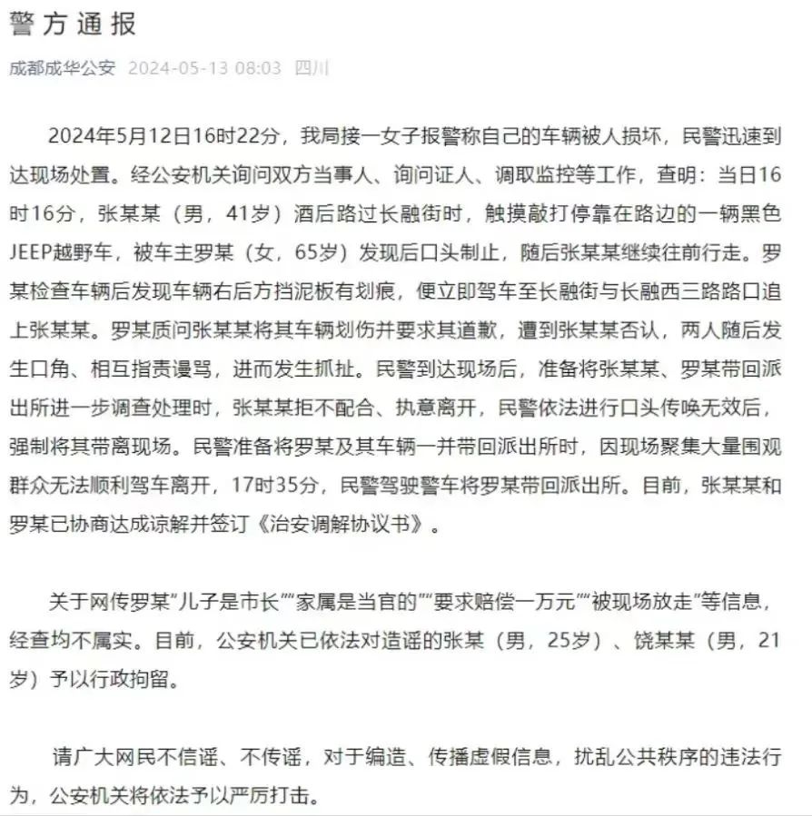 5月13日8時(shí)許,成都市成華區(qū)警方發(fā)布通報(bào)介紹事發(fā)過程,稱5月12日16時(shí)許,張某某(男,41歲)酒后觸摸敲打??吭诼愤叺牧_某(女,65歲)的車,雙方發(fā)生口角抓扯。張某某拒不配合、執(zhí)意離開,民警依法進(jìn)行口頭傳喚無效后,強(qiáng)制將其帶離現(xiàn)場。民警準(zhǔn)備將羅某及其車輛一并帶回派出所時(shí),因現(xiàn)場聚集大量圍觀群眾無法順利駕車離開。目前,雙方已協(xié)商達(dá)成諒解并簽訂調(diào)解書,網(wǎng)傳羅某“要求賠償一萬元”“被現(xiàn)場放走”等信息均不屬實(shí),公安機(jī)關(guān)已依法對造謠的張某和饒某某予以行政拘留。該通報(bào)被光明網(wǎng)、“@四川日報(bào)”等媒體轉(zhuǎn)發(fā)后帶動輿情升溫,“#警方通報(bào)男子摸車被索賠1萬#”等熱搜話題閱讀量累積近8000萬次。部分網(wǎng)民調(diào)侃車主“神通廣大”,吐槽“以后停在路邊的車別亂摸”;有網(wǎng)民對通報(bào)內(nèi)容表示懷疑,追問為何“把吉普車圍起來”等,還有網(wǎng)民呼吁公開現(xiàn)場監(jiān)控?!癅作家劉小?!薄癅無心簡影”等大V則力挺成都警方,反問“成都市長快60的人了,怎么可能有個(gè)65歲的媽”“難道不是因?yàn)楝F(xiàn)場有人煽動造成人員聚集,怕現(xiàn)場失控才來了這么多警察嗎”。