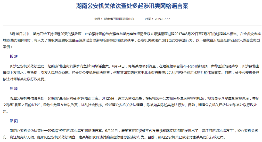 二是夸大災情險情。此類謠言主要通過捏造數(shù)據(jù)、刻畫細節(jié)、綁架“官方”等伎倆,夸大災情險情,增強謠言的“可信度”。較為常見的是利用聳人聽聞的傷亡數(shù)據(jù)捏造受災嚴重的假象,招致人心惶惶。如湖南暴雨期間,常德市一網(wǎng)民在短視頻平臺發(fā)布居住地附近漲水視頻,編造稱“俺這里天天下雨,天天死人,半個月,三四十個人”,瀏覽量迅速破10萬次,遭到行政處罰;平江縣一網(wǎng)民在微信平臺造謠稱“很多尸體隨汨羅江被沖走,3萬多人不見了”被行政拘留。四川暴雨期間,曾某某在抖音平臺編造“達州洪災致4人死亡1人失聯(lián)”虛假信息被行政處罰等。再者,謠言詳細說明災害時間、地點及經(jīng)過等,給人一種如臨現(xiàn)場之感,難辨真假。如賬號“正能量實事說事”謊稱“岳陽市君山區(qū)許市鎮(zhèn)的堤防突然決口,洪水傾瀉而入,瞬間淹沒大片農(nóng)田和村莊,數(shù)千名群眾被洪水圍困,消防、武警等救援力量正展開緊急救援”。隨著文章在各大社交平臺擴散,恐慌情緒蔓延至線下,一些商家趁機哄抬物價,部分家庭甚至開始準備撤離。還有網(wǎng)民模仿權(quán)威發(fā)布,使用“嚴峻”“危急”等標題,煽動恐慌情緒。如廣西桂林遭遇超歷史紀錄洪水,抖音網(wǎng)民“土豆炒馬鈴薯”發(fā)布一則“情況緊急的新聞通知”造謠稱“接到上級電話,平樂縣新田水庫塌了”,引發(fā)不知情的網(wǎng)民留言追問情況。