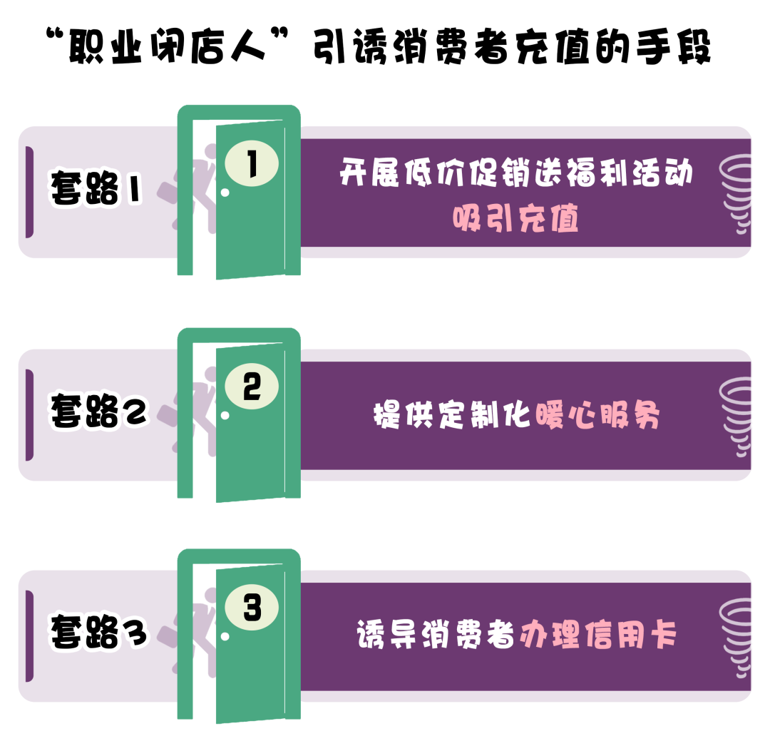 為了讓消費者掏錢,“職業(yè)閉店人”們可謂無所不用其極:一是打出“開業(yè)促銷送福利”的口號,以優(yōu)惠的價格引誘消費者充值。二是提供“定制化暖心服務(wù)”,培訓(xùn)銷售、教練為不同年齡層、不同性別消費的者提供情緒價值,以貼心舉動引誘消費者充值。三是推出信用卡特惠充值活動,“職業(yè)閉店人”通過勸說消費者參加店鋪與銀行的聯(lián)名活動,讓消費者辦理信用卡,隨后告知消費者凍結(jié)信用卡便可升級會員,在消費者凍結(jié)信用卡后刷卡提現(xiàn)。