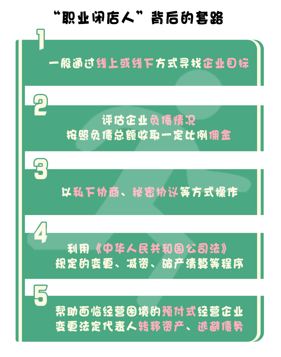 一些中介、機(jī)構(gòu)或者個人,通過熟人介紹、自行尋找、在社交平臺發(fā)布“收負(fù)數(shù)店鋪”相關(guān)帖文等方式,與負(fù)債或者經(jīng)營困難的預(yù)付式企業(yè)取得聯(lián)系并建立合作關(guān)系,評估企業(yè)負(fù)債情況收取傭金,利用法律程序?qū)ⅰ奥殬I(yè)閉店人”變更為新的法定代表人,協(xié)助負(fù)債或者經(jīng)營不善的企業(yè)跑路。與此同時,被欺騙的消費者只能看著“一地雞毛”暗自神傷,礙于維權(quán)困難只能默默吞下苦果。