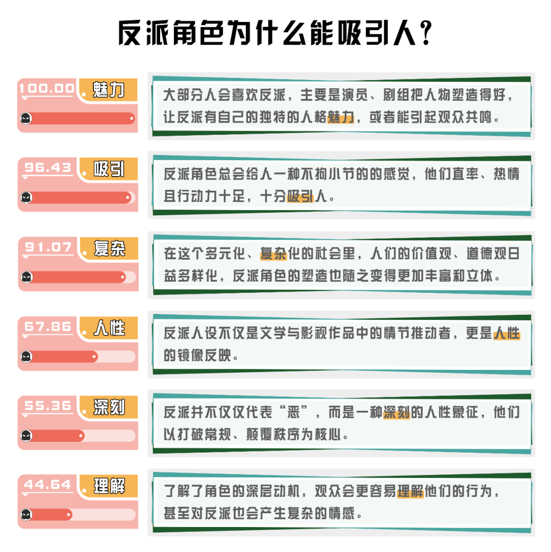 在小紅書平臺,搜集“為什么反派角色更吸引人?”相關(guān)貼文,整理分析后發(fā)現(xiàn),演員出色的演技是刻畫反派角色的基礎(chǔ)。令觀眾著迷的,往往是反派角色身上的多面性,反派角色的“惡”并不僅僅是字面意思,它是一種復(fù)雜的、深刻的人性象征,更像是一道令人捉摸不透的難解謎題。