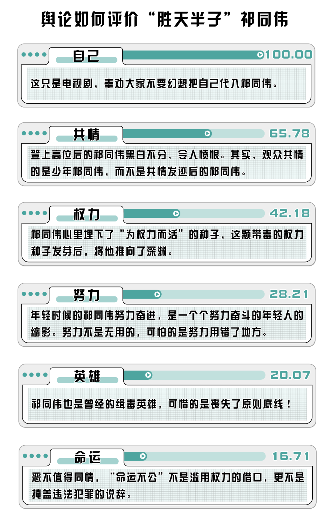 (制作:法治網(wǎng)輿情中心 數(shù)據(jù)來源:收集知乎問題“為什么有那么多人會共情《人民的名義》中的祁同偉”下的920個回答,對選取的回答進行數(shù)據(jù)清洗及自然語言處理,將熱度最高的詞語規(guī)定為100,并舉例子)