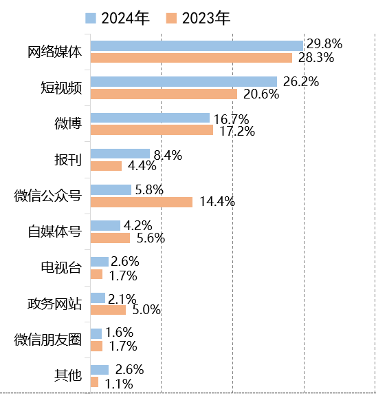 2024年,網(wǎng)絡媒體、短視頻、微博穩(wěn)居政法輿情發(fā)酵的主陣地,相關(guān)平臺產(chǎn)生的輿情數(shù)量占比累計72.7%。報刊、電視臺等專業(yè)性較強的傳統(tǒng)媒體仍占一席之地,由此發(fā)酵的輿情數(shù)量比重均有增長。相比之下,源于微博、微信公眾號與政務網(wǎng)站的輿情數(shù)量有所減少。