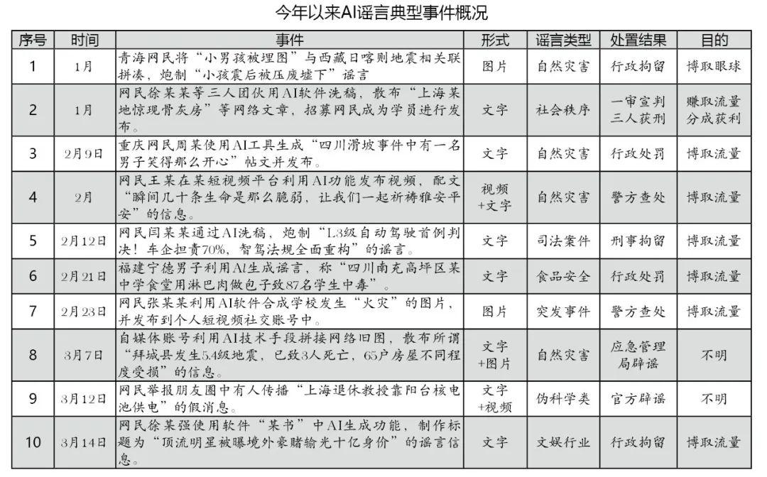 10起典型案例中,有4起AI謠言與自然災(zāi)害相關(guān),包括地震、山體滑坡等;2起謠言涉及食品安全和突發(fā)事件,分別為“四川某中學(xué)食堂用淋巴肉做包子致87名學(xué)生中毒”和“某地學(xué)校發(fā)生火災(zāi)”;還有4起謠言分別涉及偽科學(xué)、文娛行業(yè)、社會秩序和司法案件四個方面。AI謠言表現(xiàn)形式較多,大多通過微博、微信、短視頻等社交媒體渠道擴散,并以文字、圖片、視頻形式單一或“搭配”傳播,比如“西藏定日縣地震一小孩被壓廢墟”謠言形式為圖片,“上海退休教授靠陽臺核電池供電”謠言則是以“文字+視頻”的形式傳播。造謠動機方面,有8起事件明確提到造謠者是為了蹭熱點、賺取流量收益,可見流量經(jīng)濟仍然是AI謠言存在的底層邏輯。10起事件中,有2起事件被官方辟謠,但沒有其他情況通報,其余8起均有明確處理結(jié)果。處置結(jié)果方面,10起事件中有5起事件的造謠者被公安機關(guān)給予行政處罰或行政拘留,有2起事件進入到司法流程,網(wǎng)民閆某某因刻意炒作“國內(nèi)首例智能駕駛致死案”,被屬地警方刑事拘留;網(wǎng)民徐某某等3人散布“上海某地驚現(xiàn)骨灰房”等謠言,獲利數(shù)額較大,被上海當?shù)胤ㄔ阂苑欠ń?jīng)營罪判處有期徒刑一年十個月不等。
