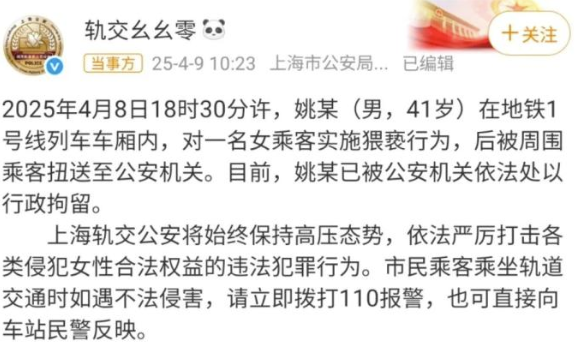 4月9日上午,多段網(wǎng)傳視頻引發(fā)關注,視頻顯示,上海地鐵一名女乘客疑似被猥褻,對身邊男子哭喊道“你把褲子脫了并弄到我身上”,同車女子稱“姐妹,我錄了視頻,我陪你去”?!癅荔枝新聞”等媒體跟進報道,上海地鐵客服工作人員稱確有其事,網(wǎng)民痛斥男子“變態(tài)”“垃圾”。當日10時23分,上海市公安局城市軌道和公交分局官微“@軌交幺幺零”發(fā)通報稱,“4月8日18時30分許,姚某在地鐵1號線列車車廂內(nèi),對一名女乘客實施猥褻行為,被周圍乘客扭送至公安機關。目前,姚某已被公安機關依法處以行政拘留”。多數(shù)網(wǎng)民稱贊警方行動快速;部分網(wǎng)民表示不滿,認為行政拘留處罰較輕。4月10日,男子所在的工作單位發(fā)布公告,宣布將其開除。